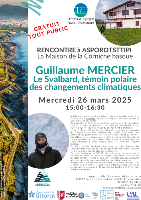 Qui est Guillaume MERCIER: Actuellement en résidence à Nekatoenea dans le cadre du projet 'ARRISKUAâ?? portant sur les risques naturels liés à l'eau sur le littoral basque, Guillaume Mercier est écologue, spécialisé sur les régions polaires.